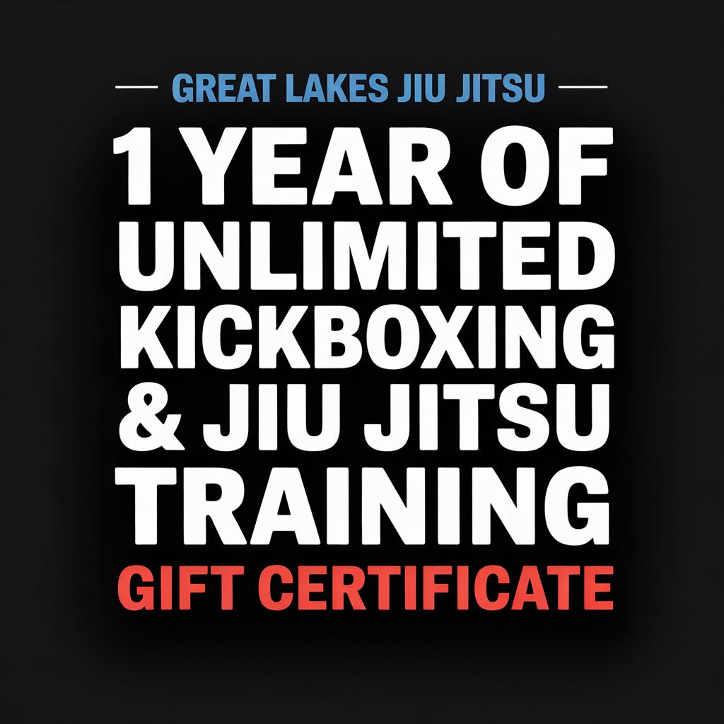 This gift certificate grants one full year of unlimited kickboxing and Jiu-Jitsu training at Great Lakes Jiu-Jitsu. A powerful gift that supports long-term growth, discipline, confidence, and physical development. The recipient becomes part of our academy community and has the opportunity to make lasting progress.